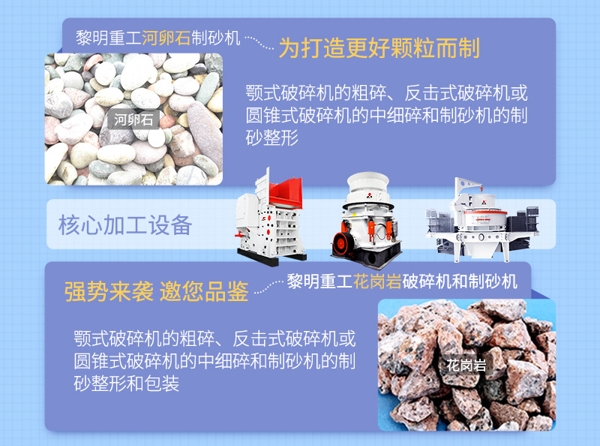首先河卵石原料先由顎式破碎機(jī)進(jìn)行粗碎處理,將大石塊的河卵石破碎成小石塊,達(dá)到中、細(xì)碎入料要求即可。然后將顎式破碎機(jī)成品輸送至圓錐破碎機(jī)或反擊破碎機(jī)中進(jìn)行細(xì)碎處理,破碎成5公分左右的小石子,再用震動(dòng)篩篩分后進(jìn)入下一道工序。